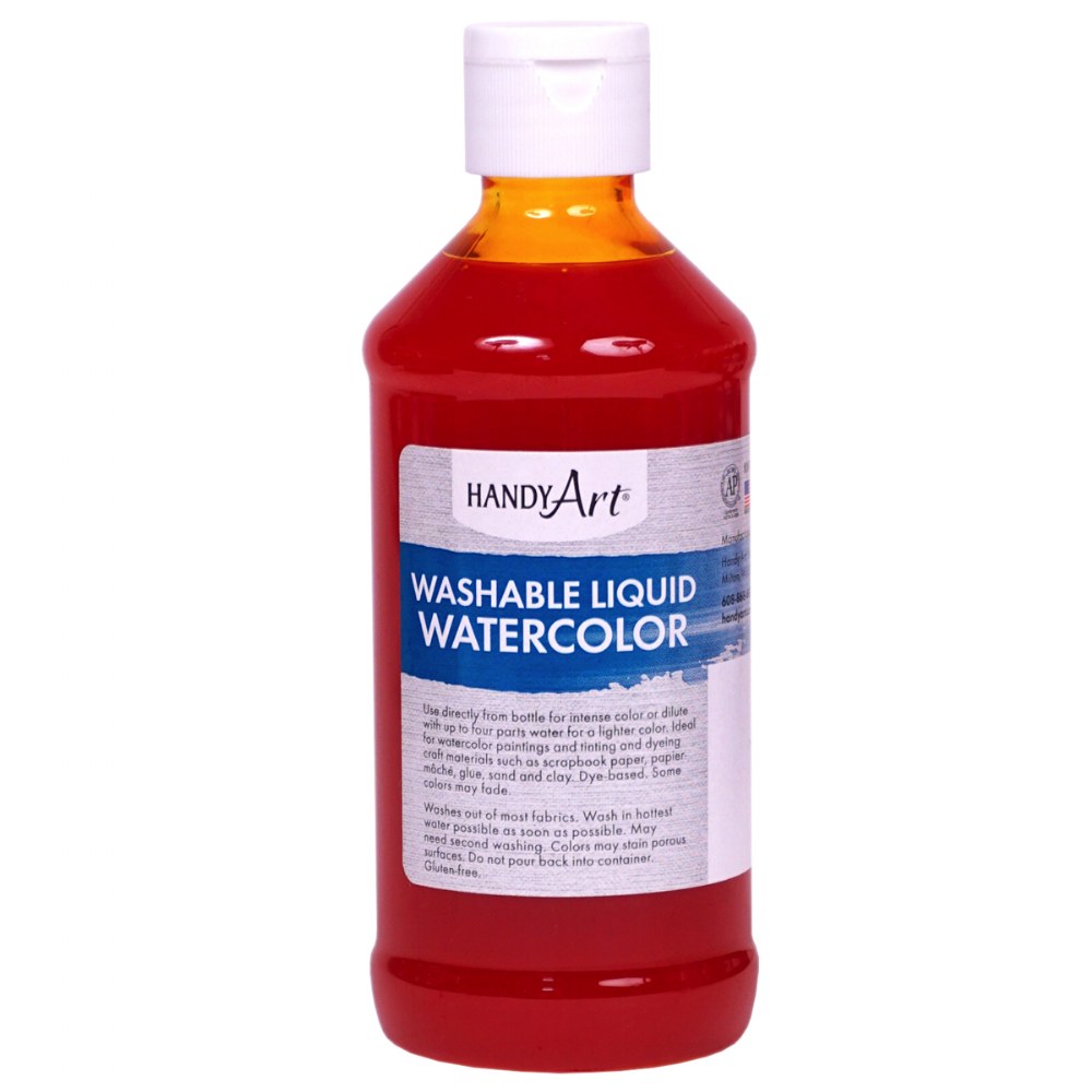 3 years & up. Washable Liquid Watercolors in 8 oz. bottles have a convenient flip-top cap for easy dispensing. Non-Toxic and AP certified. Made in the USA. Available in a variety of colors.