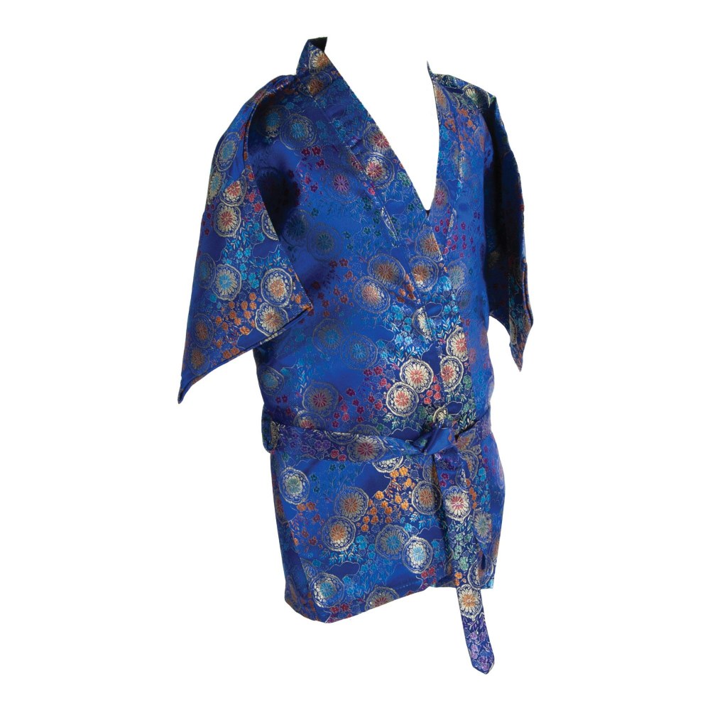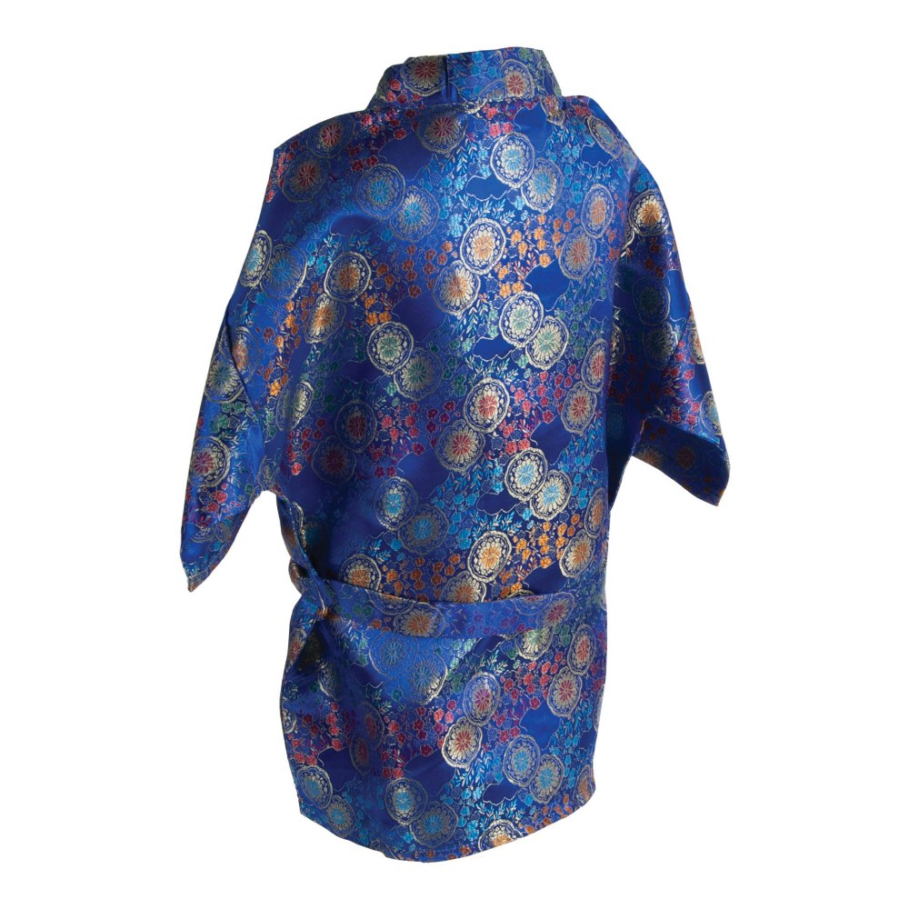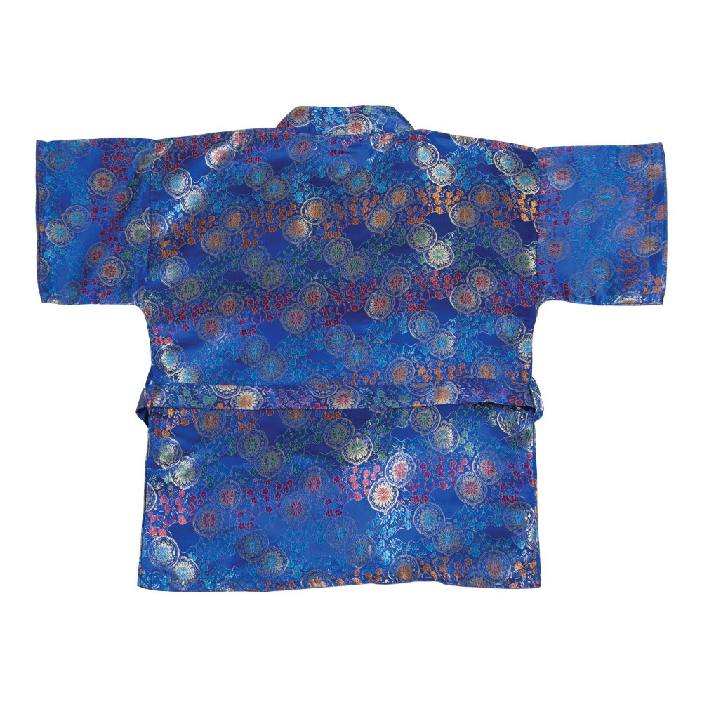 Chinese Daopao Boy - A stylistically patterned wrap top and matching belt represents the traditional colors and designs of the daopao, a traditional Chinese boy's wrap. The wrap is worn like a robe with a simple belt tied around the waist to keep it closed.